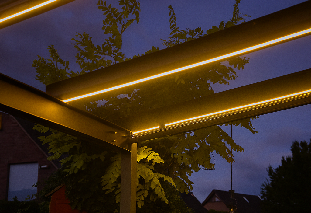 Die LED-Stripes fügen sich nahtlos in die Sparrengeometrie ein und sorgen für atmosphärische Beleuchtung unter Ihrem Terrassendach.